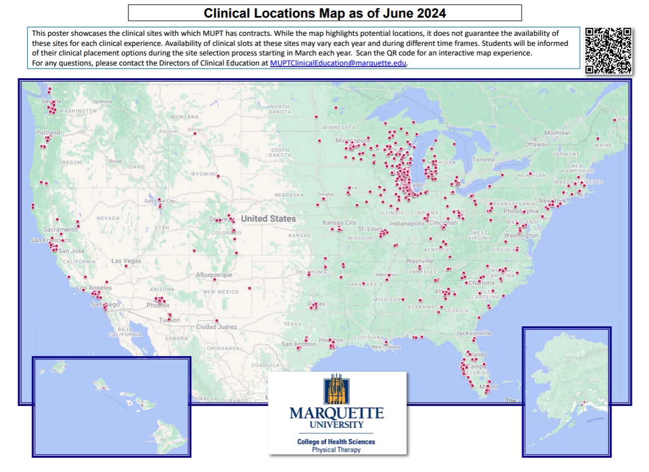 At Marquette PT, there are 3 dedicated Directors of Clinical Education (DCEs) assigned to our professional phase students to assist them in selecting and completing their clinical education experiences (CEEs). Our CEEs are located throughout the curriculum, meaning that students learn skills in didactic coursework and labs and are then able to immeadiately apply those skills with real patients on a clinical experience. Marquette PT provides clinical opportunities across all 50 states and in a variety of settings, and all students get experience in outpatient orthopedics and inpatient settings.