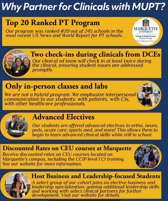 If you are a prospective or current clinical partner, please look at the benefits of taking a Marquette PT student, and an overview of our clinical education program.