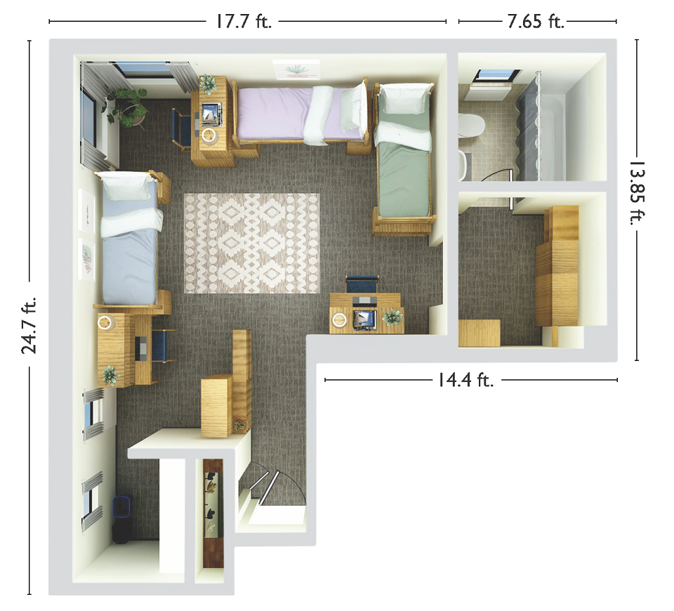 Abbottsford Hall is a residence hall in the center of campus which houses first-year students only. It is co-ed by floor. The building consists of triple room-types and has 24/7 Security. The building has private bathrooms in each room. Abbottsford is the home to the Business Living-Learning Community.