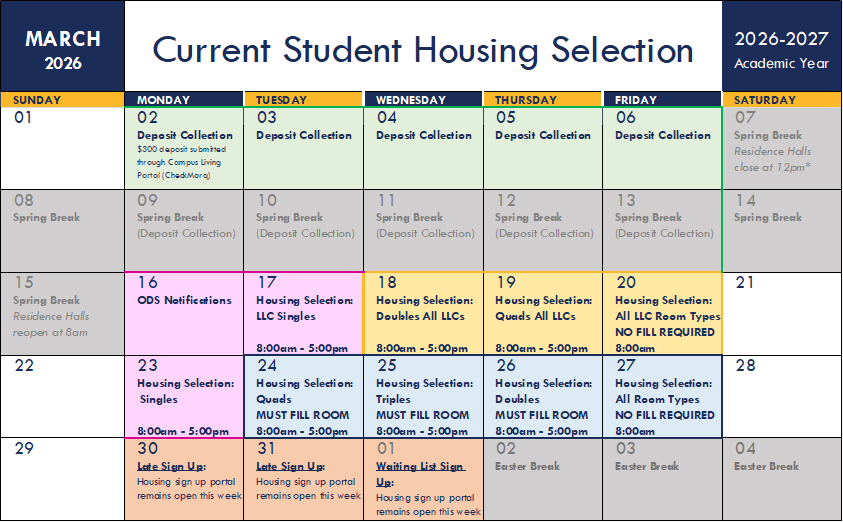 *Returning LLCs will sign up for housing on March 17 (Singles), March 18 (Doubles) or March 19 (Quads)