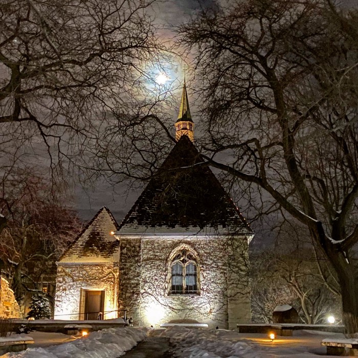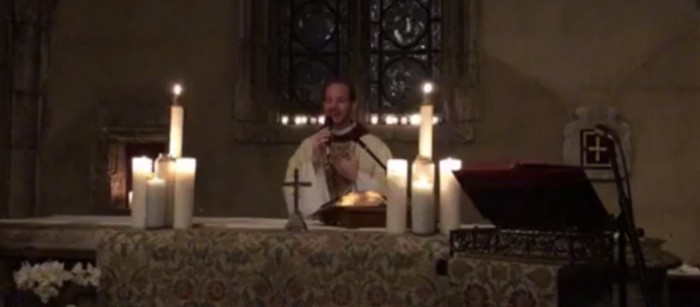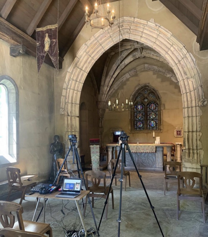 The first time we livestreamed Tuesday Night Mass from the St. Joan of Arc Chapel was a catastrophe. Using a tripod, an iPhone and my laptop, we went “live” on Facebook at 9:55 p.m. Who knew that 15th century chapels are not WiFi friendly?