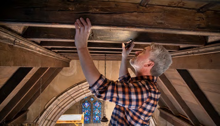 Painted wood elements on the Chapel ceiling date from the 16th Century and are a character defining feature of the interior. To ensure long term preservation of these finishes it is important to examine them carefully. Visual inspections help identify issues such as warped or spilt wood panels. A comprehensive evaluation not only requires physical assessment but also other methods such as laboratory analysis, which is currently ongoing. These efforts will help determine the best procedures for conservation.