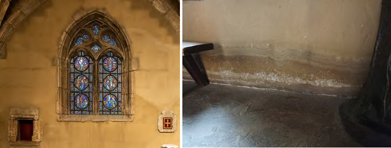 Several contributing factors are adversely affecting the interior plaster finish of the Chapel. Rising damp is visible at the base of the wall resulting from moisture introduced by landscape plantings and mulch beds at the perimeter of the chapel. In the Nave and sanctuary, water staining is visible below window sills and cracks in the plaster are evident at the window heads.