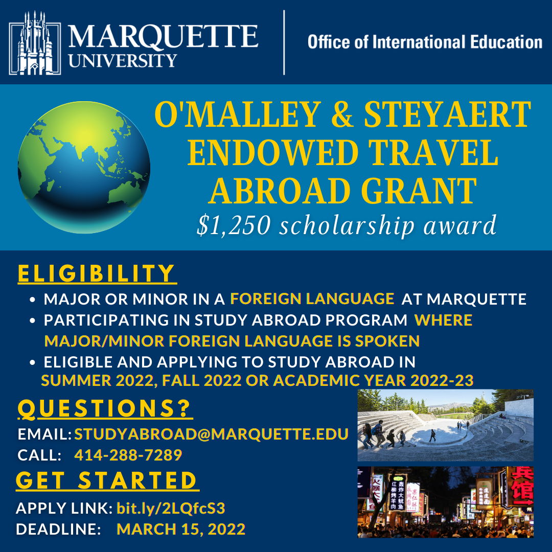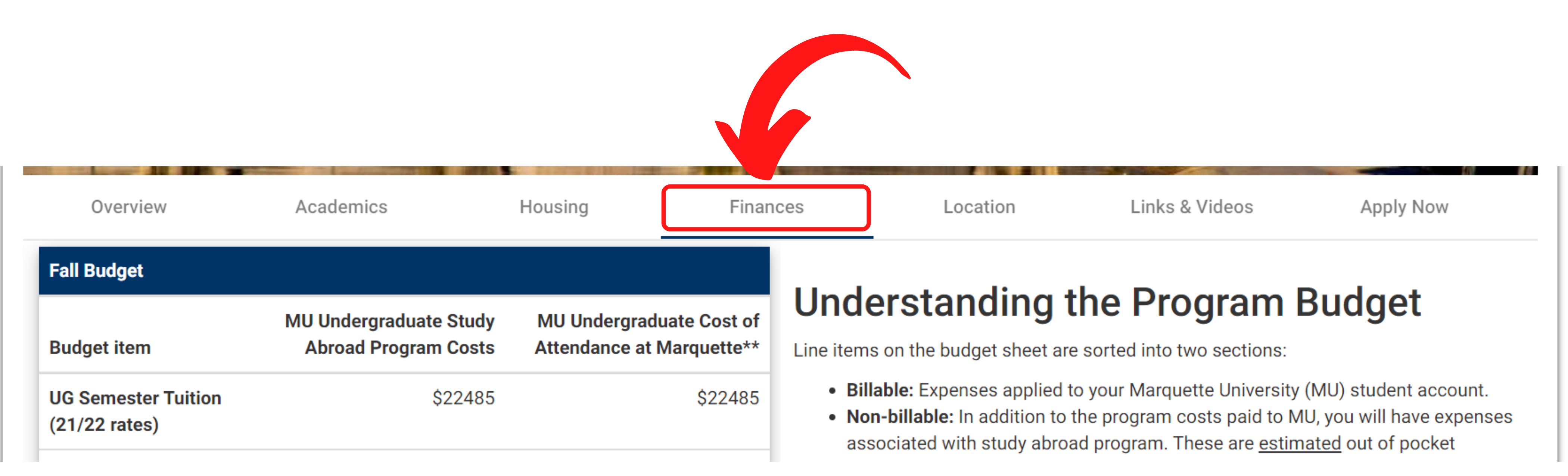 Check out our affordable study abroad programslist. We have compared costs across all Marquette study abroad programs to the cost of attending Marquette. View program-specific expenses of a study abroad program through the 'Finances' tab on aprogram's brochure page.