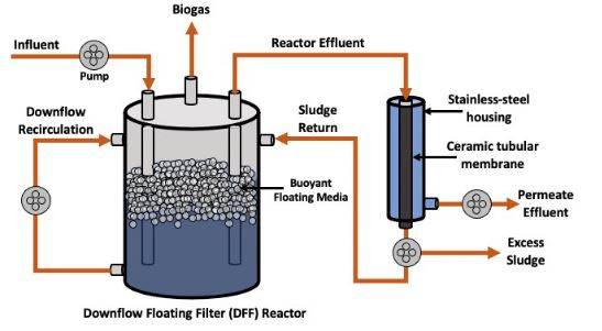 The project team is developing a novel sewage treatment system that is sustainable and creates energy from wastewater. The anaerobic membrane bioreactor (AnMBR) relies on our new materials and downflow filter (DFF) technology in which select microbes convert sewage to biogas containing methane. The methane can be burned in a boiler or engine gen-set to provide heat and electricity. The new process uses less energy and is more sustainable than current sewage treatment methods. In the future, a large pilot system is planned for testing at a regional sewage treatment facility. Nutrient recovery and reuse for agriculture as well as advanced disinfection for water reuse are planned. A startup company, ThaneSource Technologies, has been established to market the new technology.