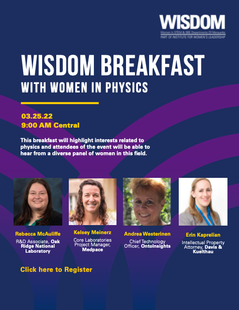 This WISDOM Breakfast event will be focused on Women in Mathematics and host panelists from Marquette and beyond. Attendees of the event will be able to meet panelists in small groups for open Q&A around the experiences working in their fields, as well as hear from the entire panel.