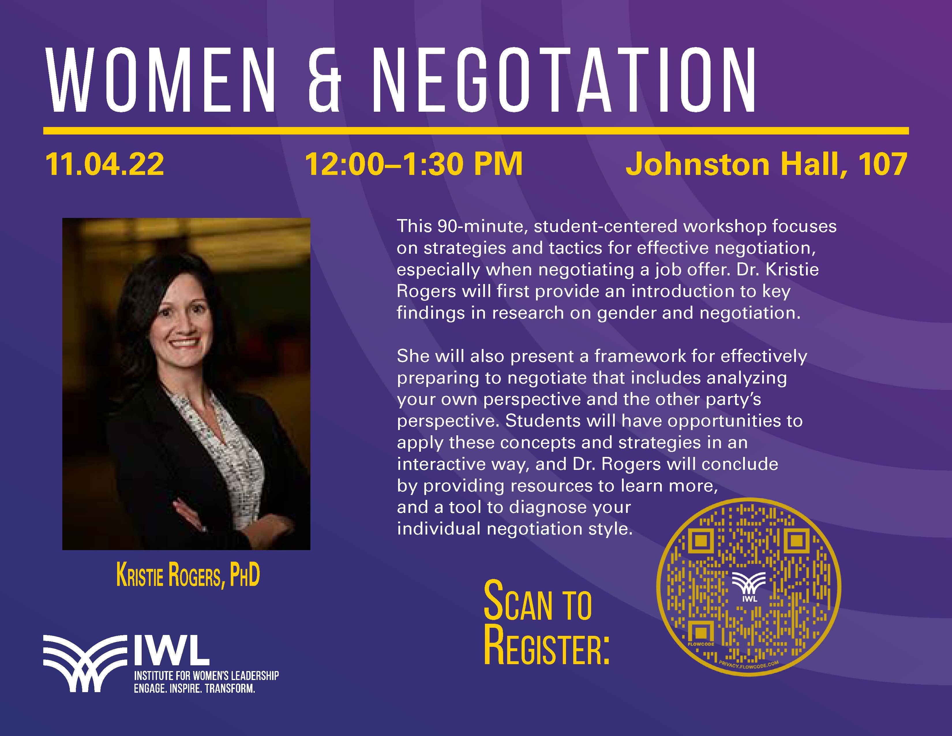Women and Negotiation Workshop Friday, November 4, 2022| 12:00–1:30 p.m. | Johnston Hall, 107