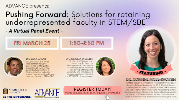 IWL cross-promoted this event. ADVANCE welcomed Dr. Corinne Moss-Racusin, Associate Professor of Psychology at Skidmore College, who spoke and answered questions on her article, 'Boosting the Sustainable Representation of Women in STEM with Evidence-based Policy Initiative.' Dr. Joya Crear, Vice President for Inclusive Excellence, and Dr. Jennica Webster, Associate Professor of Management and Co-Director of the Institute for Women's Leadership, joined the panel to discuss current and future implementations for retaining women and underrepresented faculty in STEM/SBE at Marquette University, as well as the results of the MU Climate Survey administered to faculty in Spring of 2020. ALL were invited.
