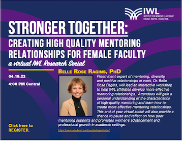 IWL Research Social—Stronger Together: Creating High Quality Mentoring Relationships for Female Faculty April 19, 2022 | 4:00 p.m. | Virtual Event | More Information
