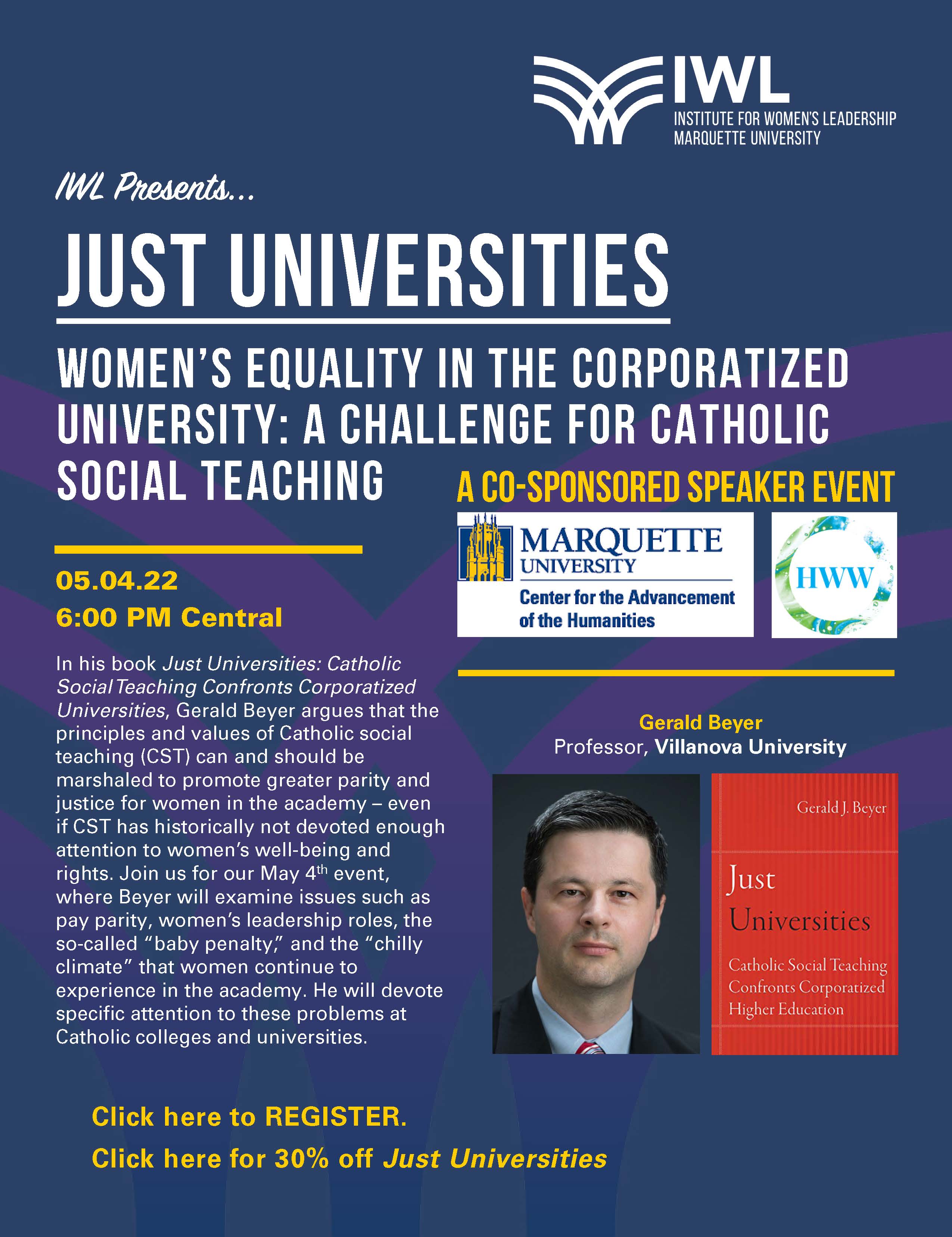 In his book Just Universities: Catholic Social Teaching Confronts Corporatized Universities, Gerald Beyer argues that the principles and values of Catholic social teaching (CST) can and should be marshaled to promote greater parity and justice for women in the academy – even if CST has historically not devoted enough attention to women’s well-being and rights. At this virtual speaker event, Beyer examined issues such as pay parity, women’s leadership roles, the so-called “baby penalty,” and the “chilly climate” that women continue to experience in the academy. He will devote specific attention to these problems at Catholic colleges and universities.