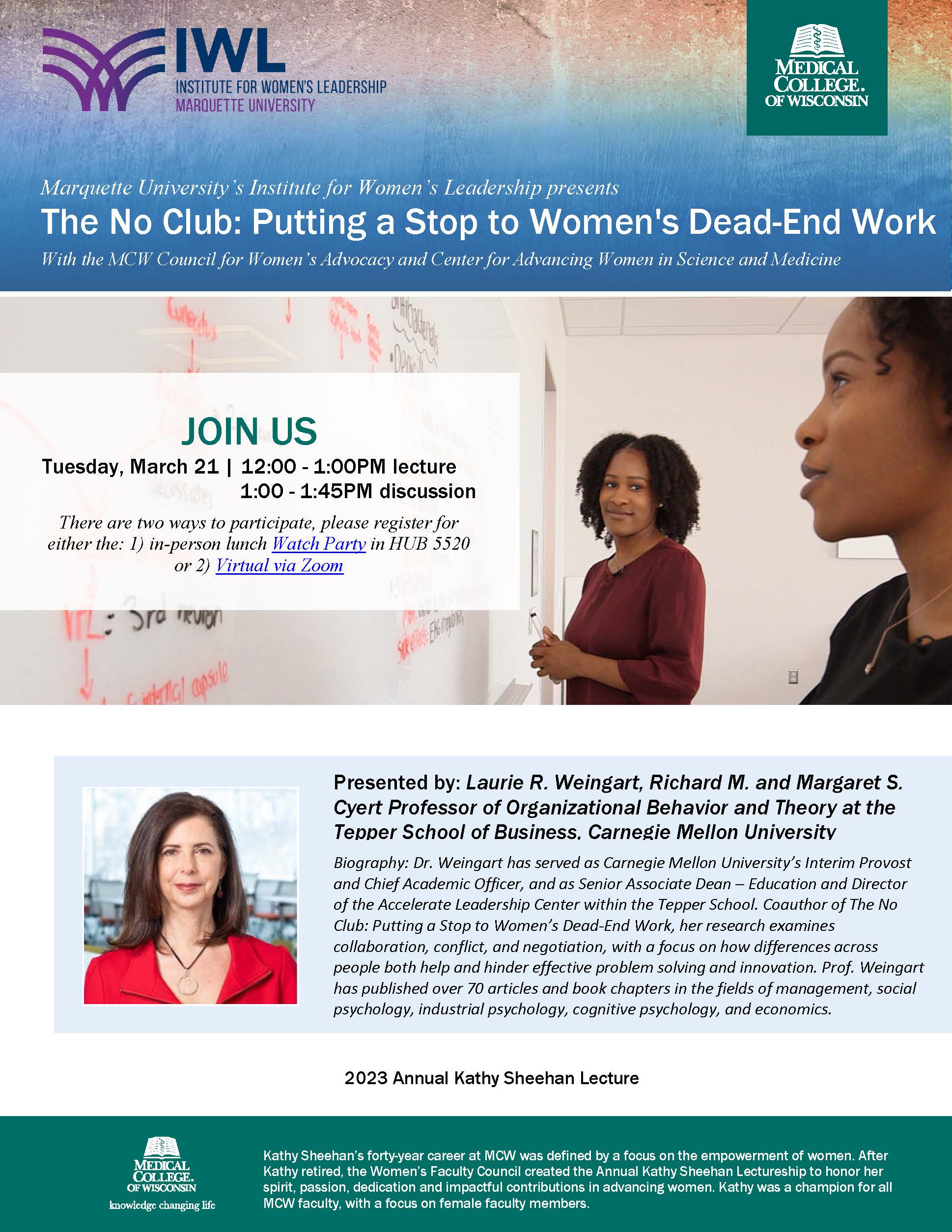 MCW & IWL present "The No Club: Putting a Stop to Women's Dead-End Work" Tuesday, March 21, 2023 | 12:00–1:45 p.m. | Virtual -OR- MCW's HUB A5520/5628