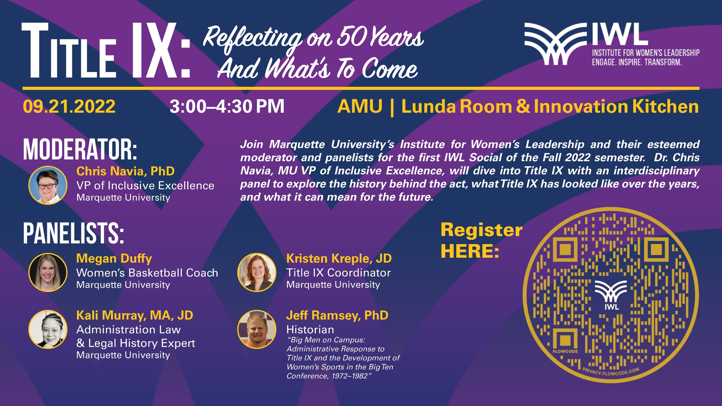Marquette University’s Institute for Women’s Leadership and their esteemed moderator and panelists hosted the first IWL Social of the Fall 2022 semester, which recognized the 50th Anniversary of the passing of Title IX into law. Dr. Chris Navia, MU VP of Inclusive Excellence, dove into Title IX with an interdisciplinary panel to explore the history behind the act, what Title IX has looked like over the years, and what it can mean for the future.