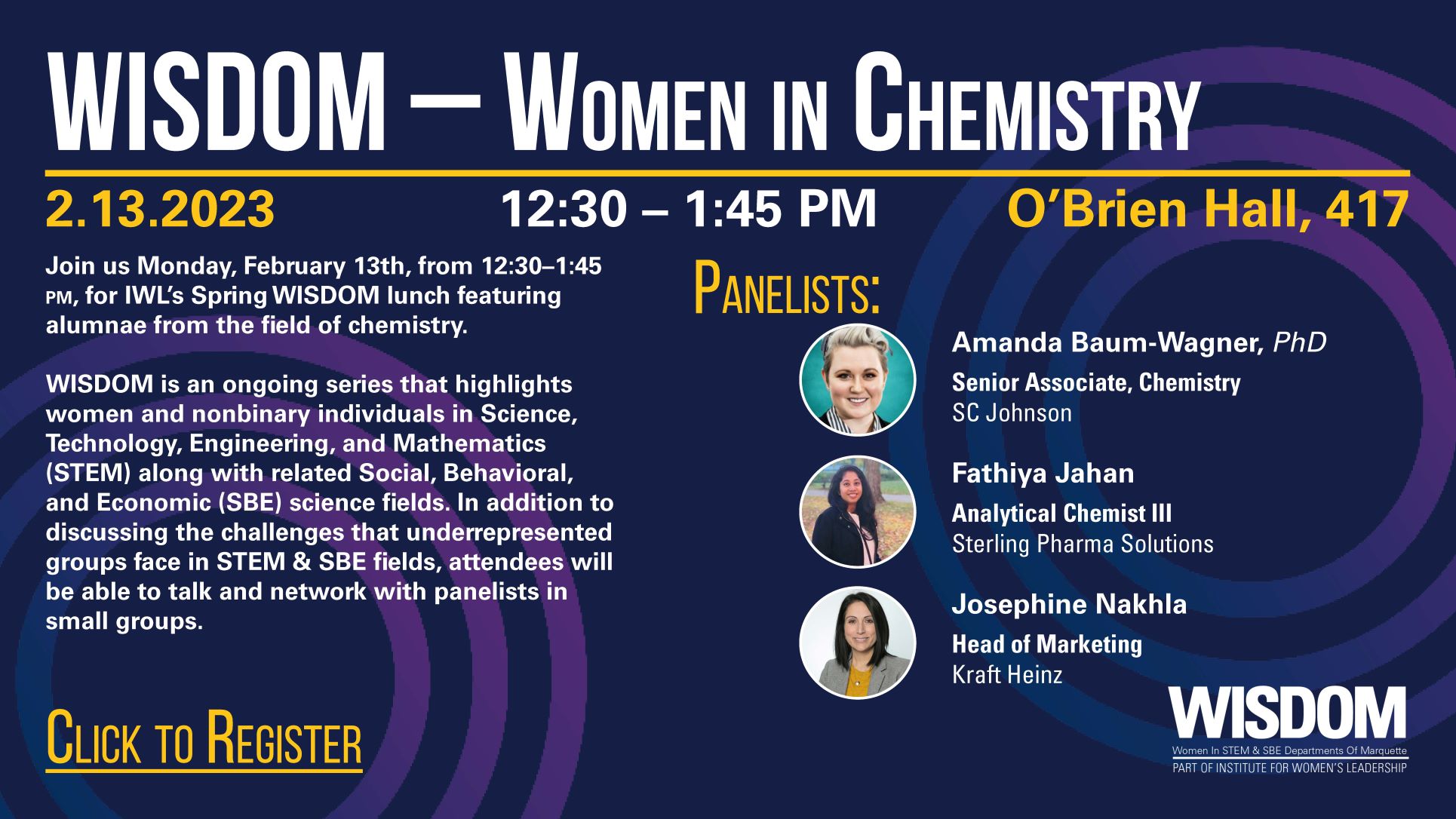 WISDOM Lunch with Women in Chemistry Monday, February 13, 2023 | 12:30–1:45 p.m. | O'Brien Hall, 417