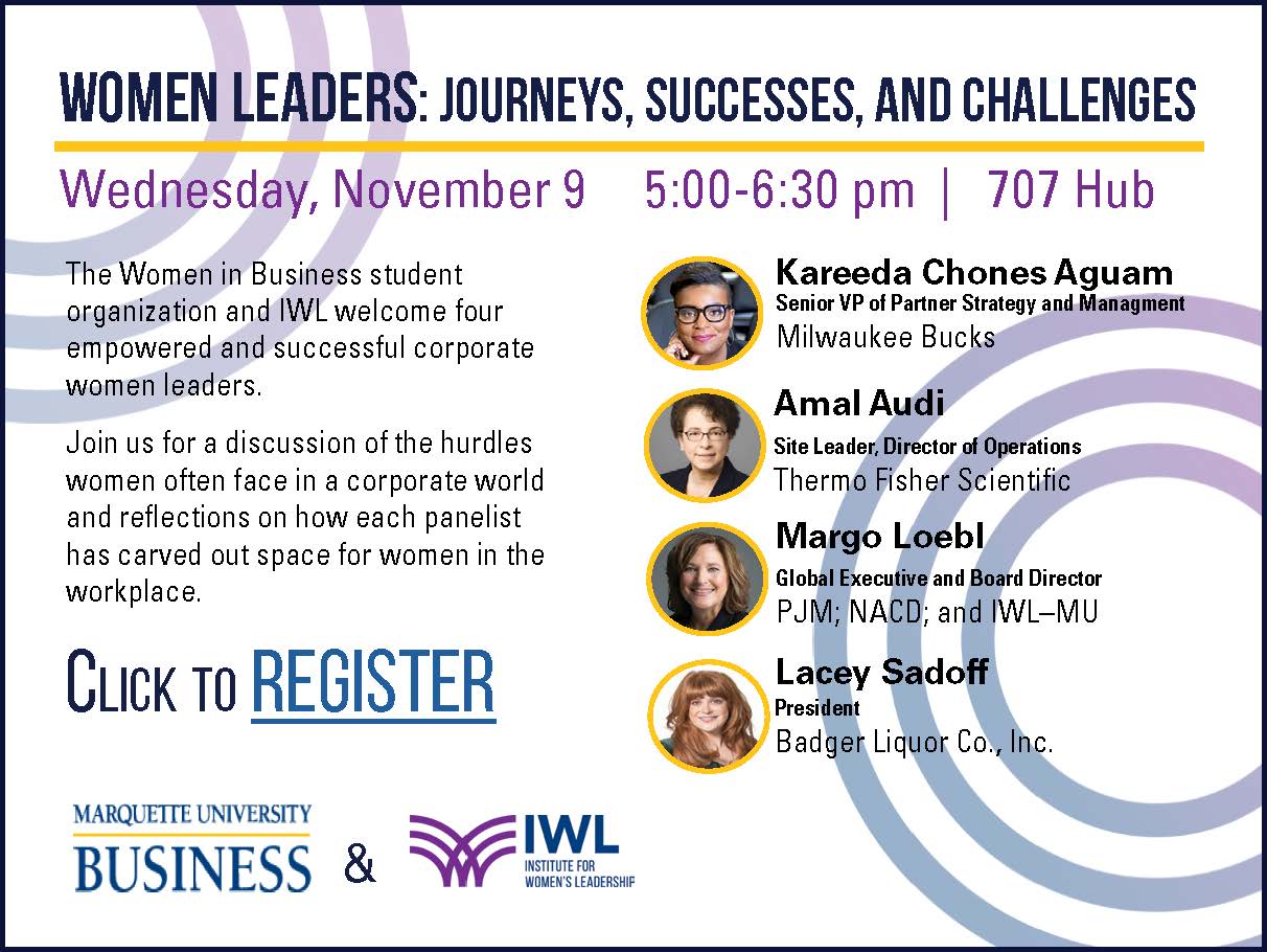 On Wednesday, November 9th, 2023, from 5:00–6:30 p.m. at Marquette's 707 Hub, IWL gathered with community for an engaging discussion with top women leaders about how they've carved a path as leaders in their field. They'll talked about what leadership entails, the career hurdles they've faced on their road to success, and how they are shaping the workplace for future generations. Our panel discussion was followed by opportunities to mingle and network with panelists and other attendees.