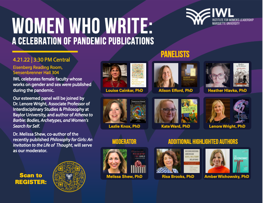 Join us to celebrate women who have published books during the COVID-19 pandemic. This event will feature a panel of authors from a variety of disciplines who have written about several intersectional topics, be lead by Marquette's very own Melissa Shew as moderator, and take place in Eisenberg Room (Sensenbrenner 304).