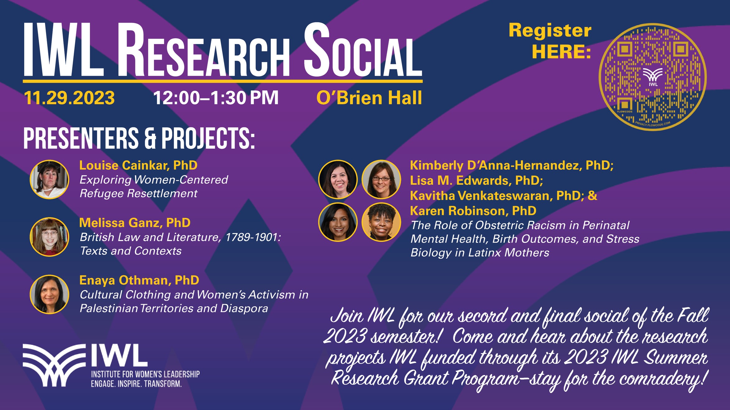 This IWL research social featured the IWL Fall '24 Faculty Fellows, who have used feminist frameworks to examine structural injustices across three distinct contexts. Attendees enjoyed some networking and light refreshments as they learned about how feminist inquiry offers a vital lens for understanding complex historical and contemporary issues!