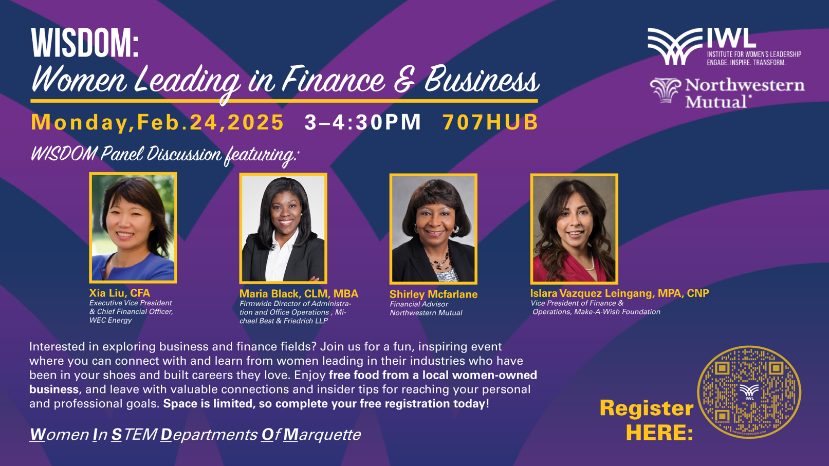 WISDOM: Women Leading in Finance and Business in collaboration with Northwestern Mutual's Wulff District Office. This interactive brunch and panel discussion invited women and non-binary students to explore diverse career paths in finance and business management. Attendees connected with peers and professionals, expand their network, and enjoyed a complimentary meal in an empowering and supportive environment.