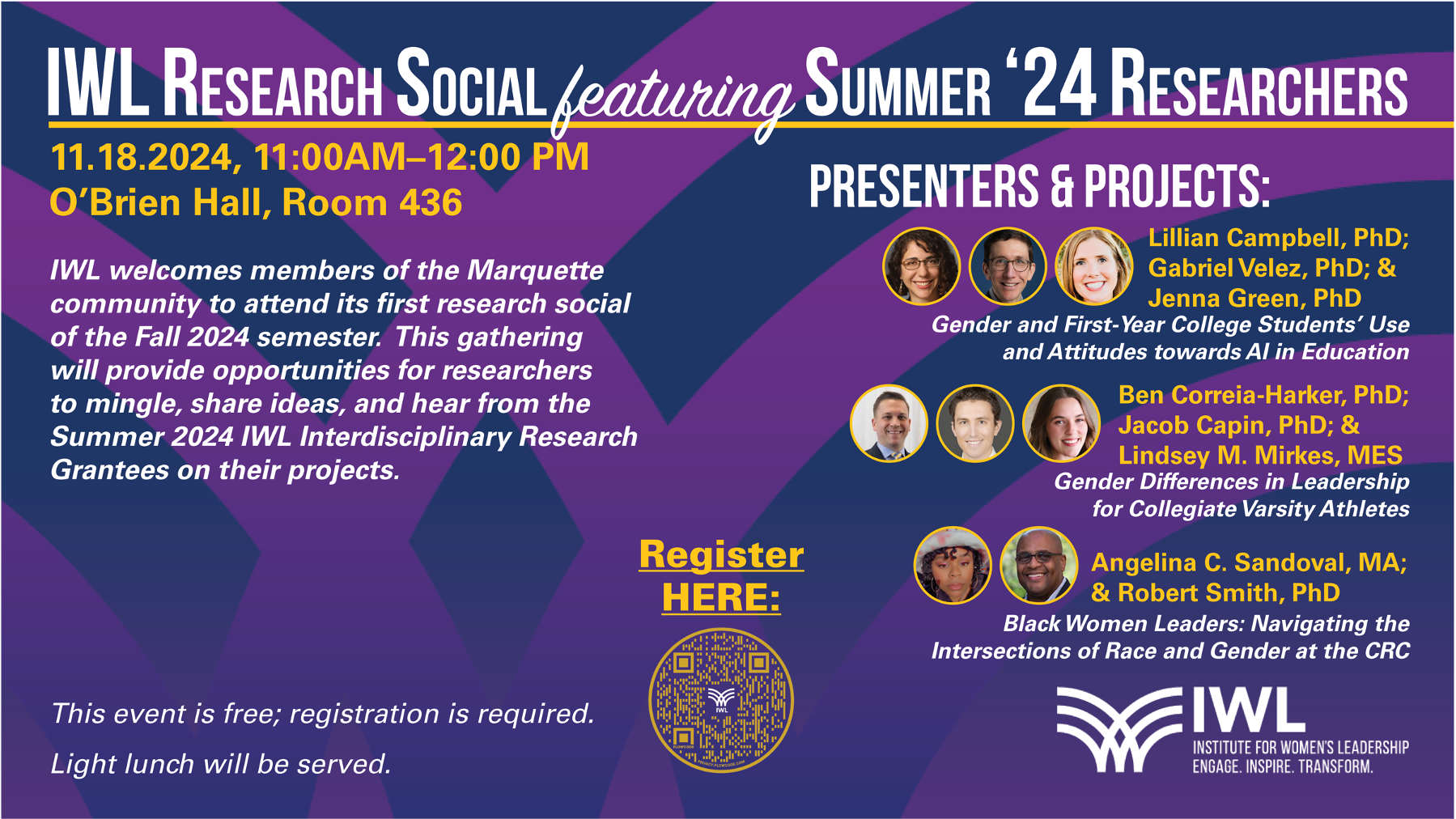 IWL welcomed members of the Marquette community to attend its second research social of the Fall 2024 semester. This gathering provided opportunities for researchers to mingle,share ideas, and hear from the Spring 2024 IWL Faculty Fellows while being among the first to receive their IWL white paper.