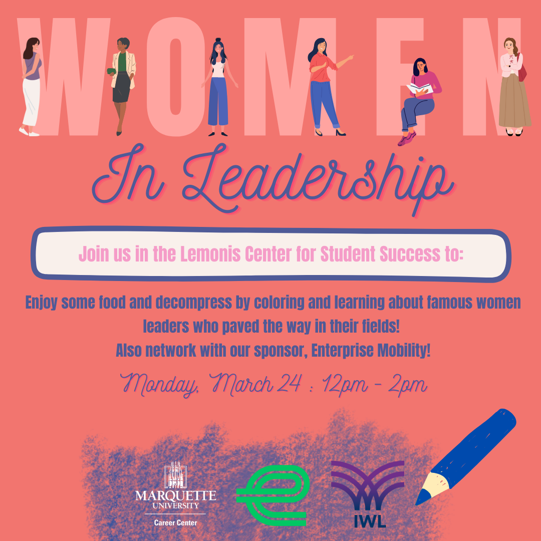 The Marquette University Career Center celebrated Women's History Month with the Women in Leadership Event with Marquette's Institute for Women's Leadership and Enterprise Mobility in the Lemonis Center for Student Success. Students enjoyed some food and decompressed by coloring and learning about famous women leaders who paved the way in their fields!