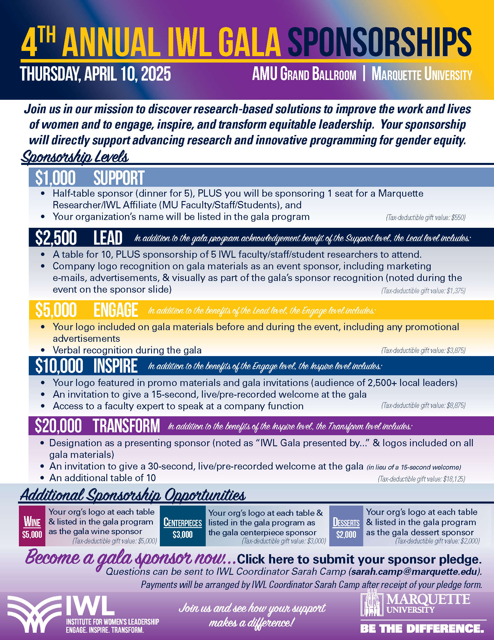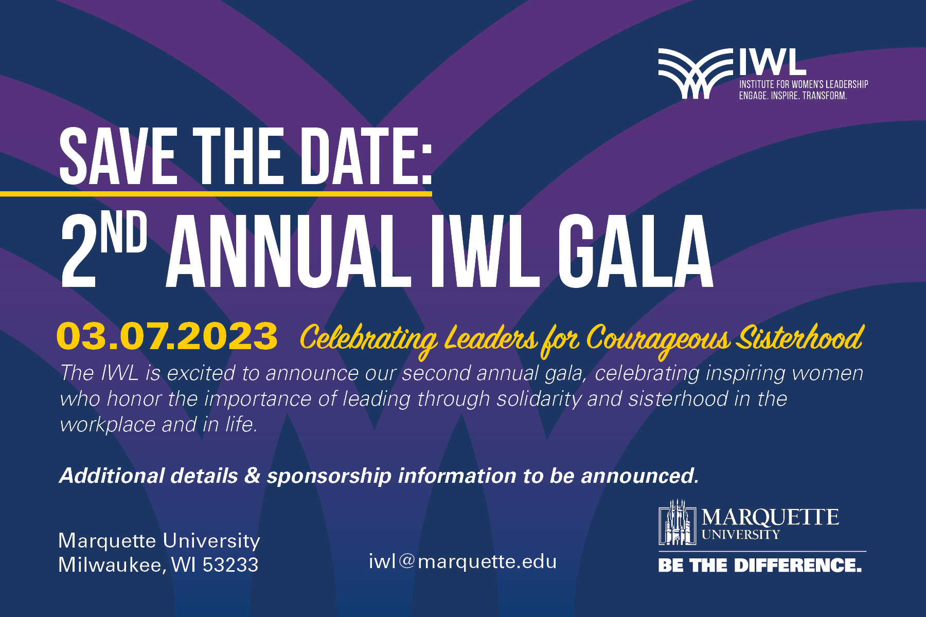 - The IWL ENGAGE AWARD for Transformational Student Leadership celebrates the leadership of a Marquette University undergraduate or graduate student who has taken action to lead others to “be the difference” for women on campus or in the community.