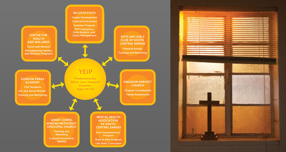 Wichita State University (WSU) hosts the Youth Empowerment Implementation Project (YEIP). While WSU provides the fiscal management and evaluation of all YEIP data, it also offers the YEIP summer program, whose key elements are career and college exploration. Forty-three predominantly Black, non-Hispanic students, ages 10-15, from Gordon Parks Academy participate in YEIP. Sixty-eight percent of the YEIP cohort live in single-parent/grandparent households, and 89% qualify for free and reduced price meals. WSU has assembled a strong set of partnerships, including the Boys and Girls Club of South Central Kansas, that provide after-school fitness and academic programming to YEIP students. The Center for Health and Wellness offers both the nutrition and the Strengthening Families curricula for the YEIP. Grant Chapel African Methodist Episcopal Church provides tutorials and cultural identity programming to the YEIP.