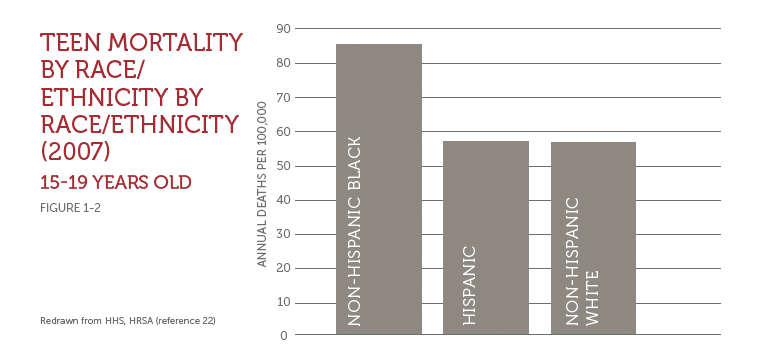In 2007, unintentional injury, homicide, and suicide were three of the leading causes of death among male and female adolescents, ages 15-19. Significant racial and ethnic disparities are clearly evident in adolescent mortality. Non-Hispanic Black mortality was 85.7 per 100,000, more than 50% higher than in Hispanic and Non-Hispanic White adolescents at rates of 57.9 and 58.0 per 100,000, respectively (Figure 1-2).