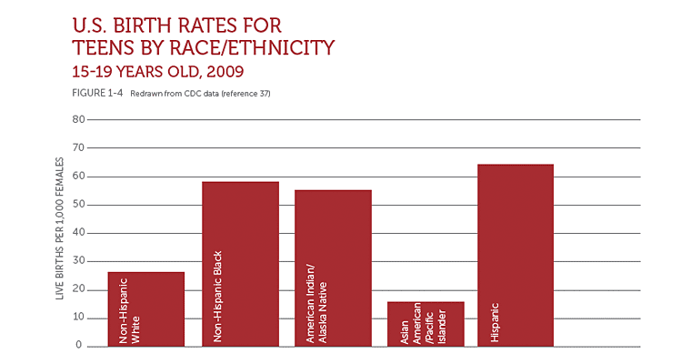 Significant racial and ethnic disparities in teen pregnancy affect several groups of minority youth more than others. In 2009, the birth rate among Hispanic female adolescents was 64 per 1,000 youth. That rate was nearly 2.5 times that of non-Hispanic Whites (ages 15-19) (Figure 1-4). Birth rates among non-Hispanic Blacks approached 60 live births per 1,000 youth, a rate more than double the rate among non-Hispanic White youth. The estimated cost of teens giving birth before age 18 is a staggering $10.9 billion dollars annually in the United States. Together, STDs and teen live births represent two major public health issues affecting minority groups disproportionately.